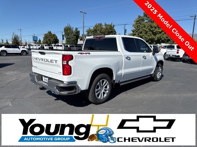 2025 Model Close Out!!! Everyone is Eligible for online price. To Qualify for the Young Chevrolet Advertised Price, customer must use Young Chevrolet Dealer Financing. Dealer is to arrange Financing for the vehicle. Cannot be combined with any other offers or discounts. Young Chevrolet Advertised Price does not include Taxes, States Fees, Registration Fees, Dealer Fees, or any Dealer Installed Accessories. You are now working with the #1 Chevrolet Dealer in Northern Utah. We take pride in offering the best selection in the state at the very best price. With over 200 years of combined automotive experience between Chevrolet and the Young Automotive Group. Call and schedule your visit with us today. Think Young, Think Young Chevrolet 801-544-1234 â" 645 N Main Street Layton Utah 84041. To Qualify for the Young Chevrolet Advertised Price, customer must use Young Chevrolet Dealer Financing. Dealer is to arrange Financing for the vehicle. Cannot be combined with any other offers or discounts. Not all buyers will qualify for available offers, incentives or discounts based on Credit, Trade, Model, Zip Code, etc. Young Chevrolet Advertised Price does not include Taxes, States Fees, Registration Fees, Dealer Fees, or any Dealer Installed Accessories. Not all Customer will qualify. Contact dealer for details. 4D Crew Cab Summit White 4WD 3.0L I6 10-Speed Automatic LTZ Price excludes any dealer installed accessories and includes: $1000 - Bonus Cash. Exp. 11/03/2025 $2500 - Customer Cash. Exp. 11/03/2025