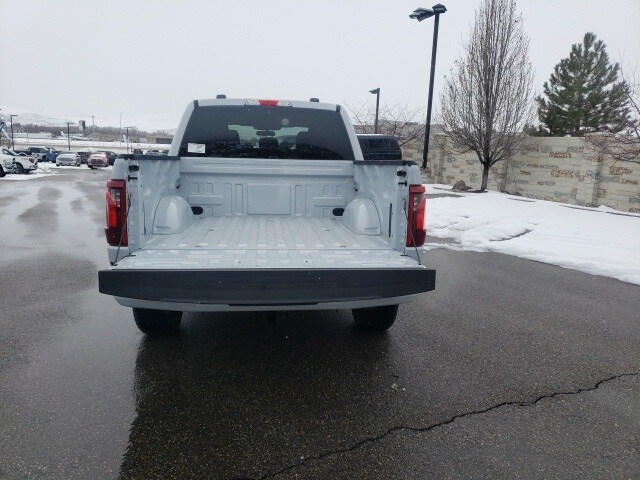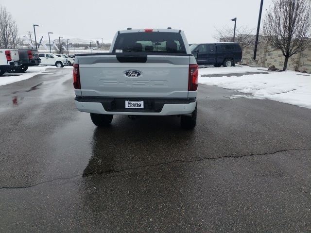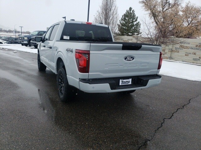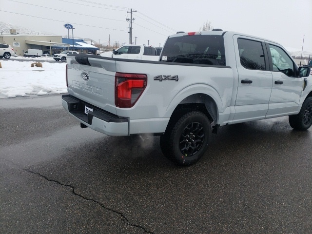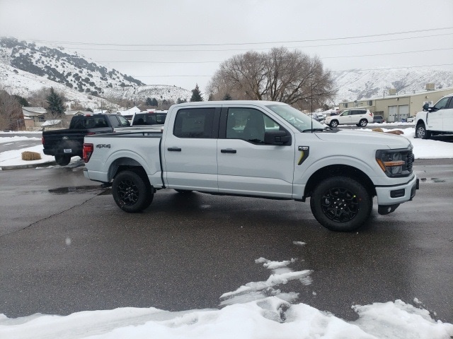 Space White Metallic 2025 Ford F-150 STX SuperCrew Cab with the 2.7L V6 Ecoboost engine. Equipped with the 18" gloss black wheels and the 36 Gallon Extended range fuel tank!