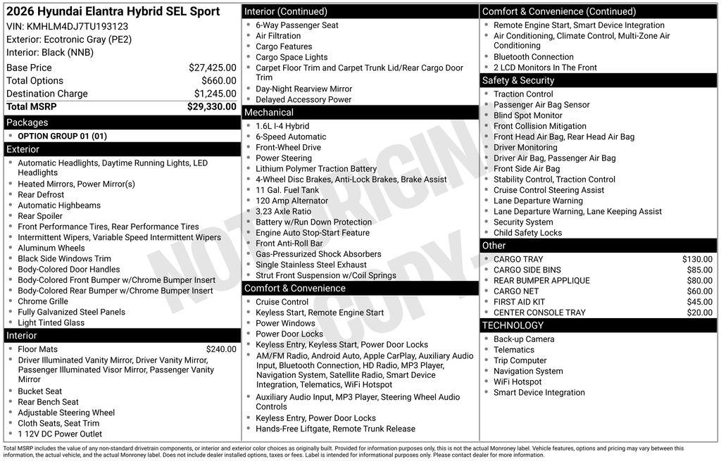 Ecotronic Gray Pearl 2026 Hyundai Elantra Hybrid SEL Sport FWD 6-Speed Dual Clutch I4 49/52 City/Highway MPG Price includes the following incentives, not all customers will qualify. See dealer for details. : $1750 - Hyundai HMF Dealer Choice : $1750 discount and 5.39% APR for 24 months. $44.05 per $1000 financed. Available to well qualified buyers who finance through Hyundai Motor Finance. H704. Exp. 04/30/2026