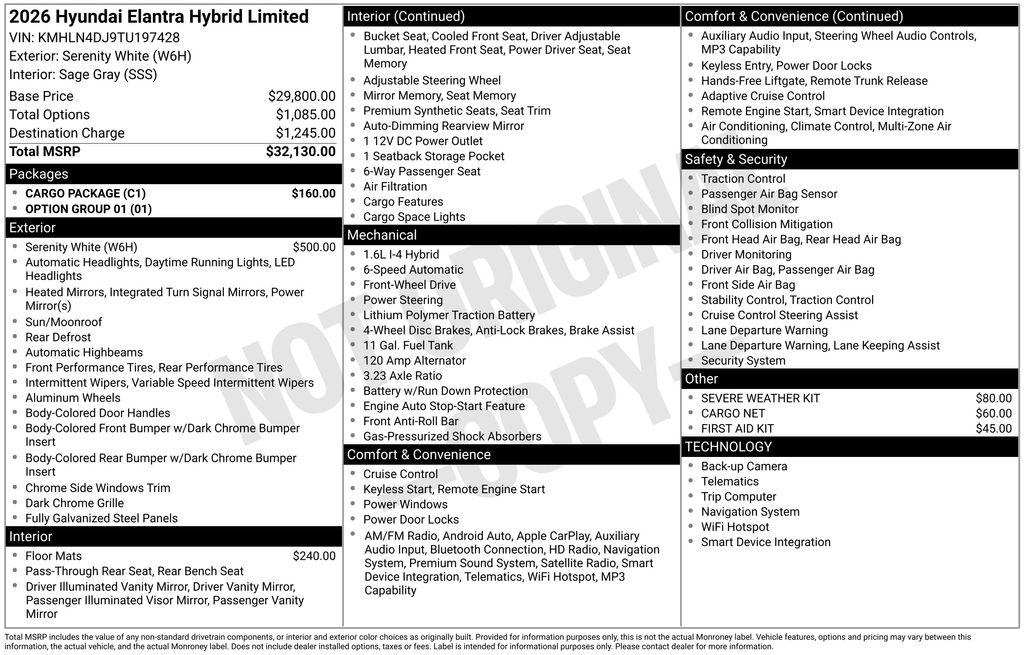 Serenity White 2026 Hyundai Elantra Hybrid Limited FWD 6-Speed Dual Clutch I4 49/52 City/Highway MPG Price includes the following incentives, not all customers will qualify. See dealer for details. : $1750 - Hyundai HMF Dealer Choice : $1750 discount and 5.39% APR for 24 months. $44.05 per $1000 financed. Available to well qualified buyers who finance through Hyundai Motor Finance. H704. Exp. 04/30/2026