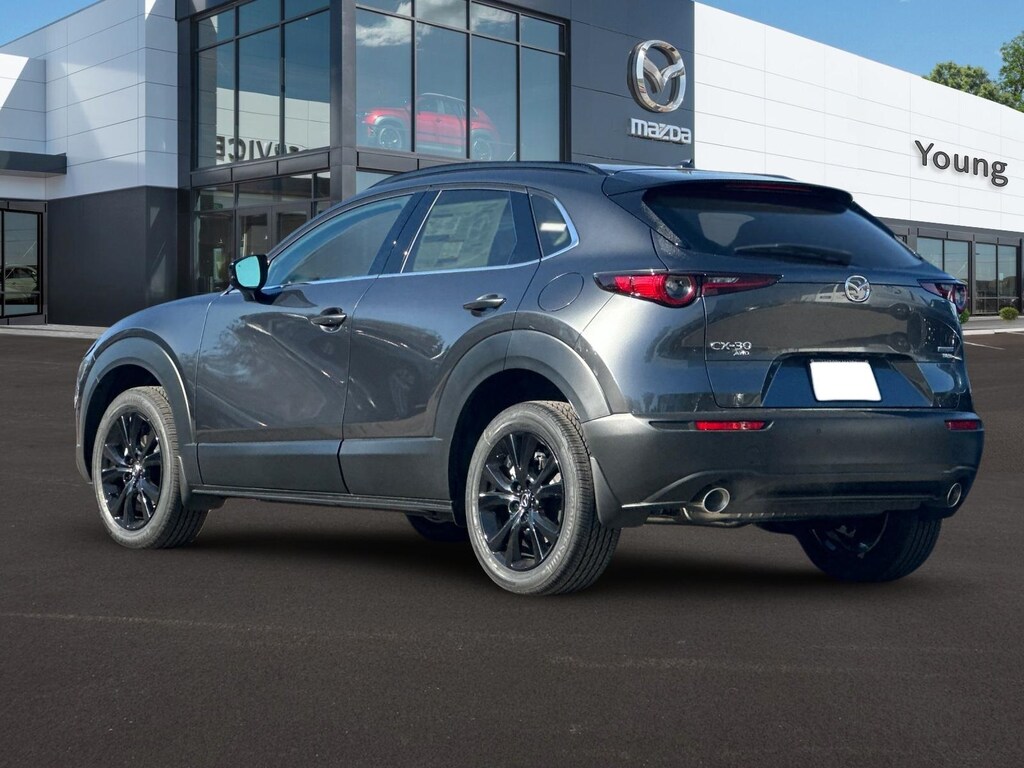 Machine Gray Metallic 2025 Mazda CX-30 2.5 Turbo Premium Plus Package w/Premium Plus Package AWD 6-Speed Automatic 2.5L I4 12 Speakers: BOSE Premium Audio, Apple CarPlay and Android Auto, Auto High-beam Headlights, Auto-dimming door mirrors, Auto-dimming Rear-View mirror, Dual front impact airbags, Dual front side impact airbags, Front anti-roll bar, Front dual zone A/C, Front wheel independent suspension, Garage door transmitter: HomeLink, Heads-Up Display, Heated Front Bucket Seats, Heated steering wheel, Illuminated entry, Knee airbag, Leather Seat Trim, Leather Shift Knob, Leather steering wheel, Machine Gray Metallic Paint, Memory seat, Occupant sensing airbag, Overhead airbag, Power driver seat, Power Liftgate, Power moonroof, Rain sensing wipers, Rear side impact airbag, Remote keyless entry, Wheels: 18" x 7J Aluminum Alloy. 22/30 City/Highway MPG
