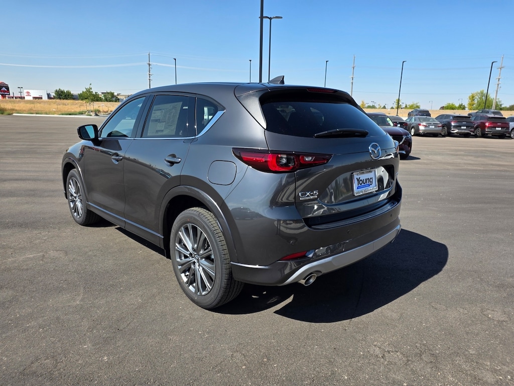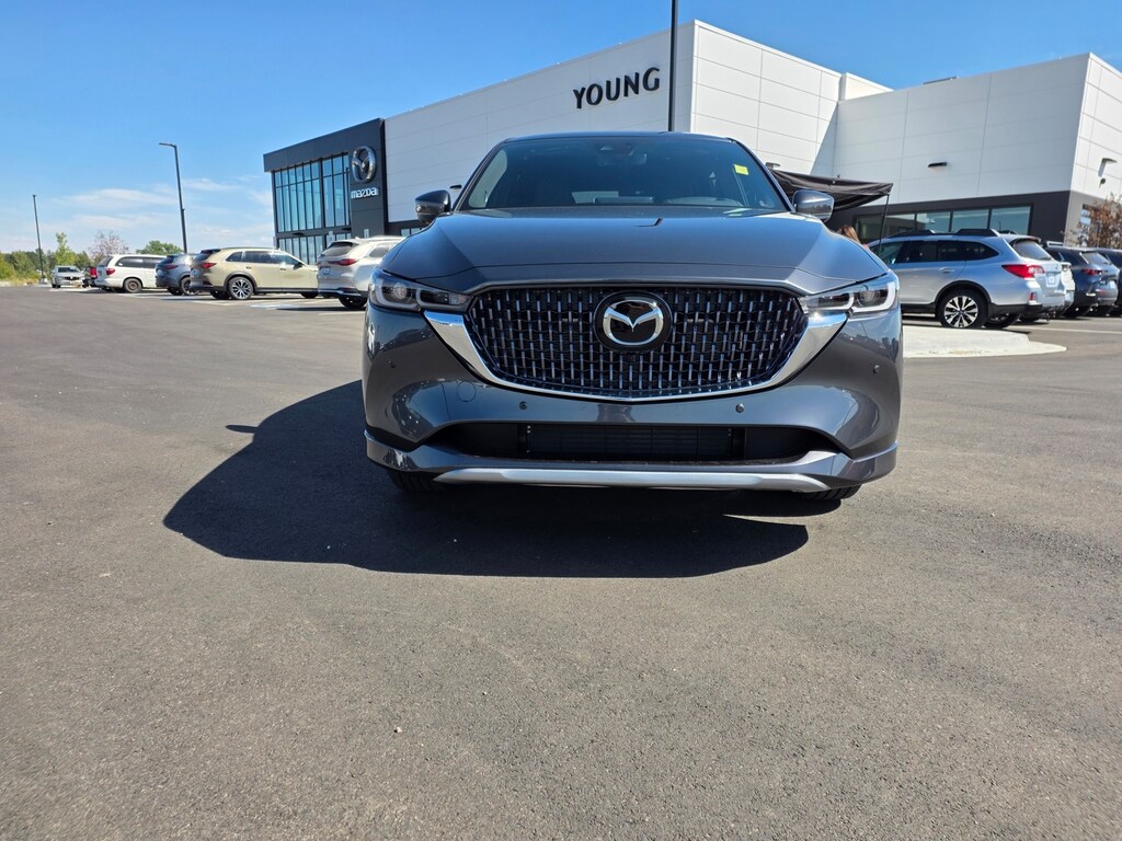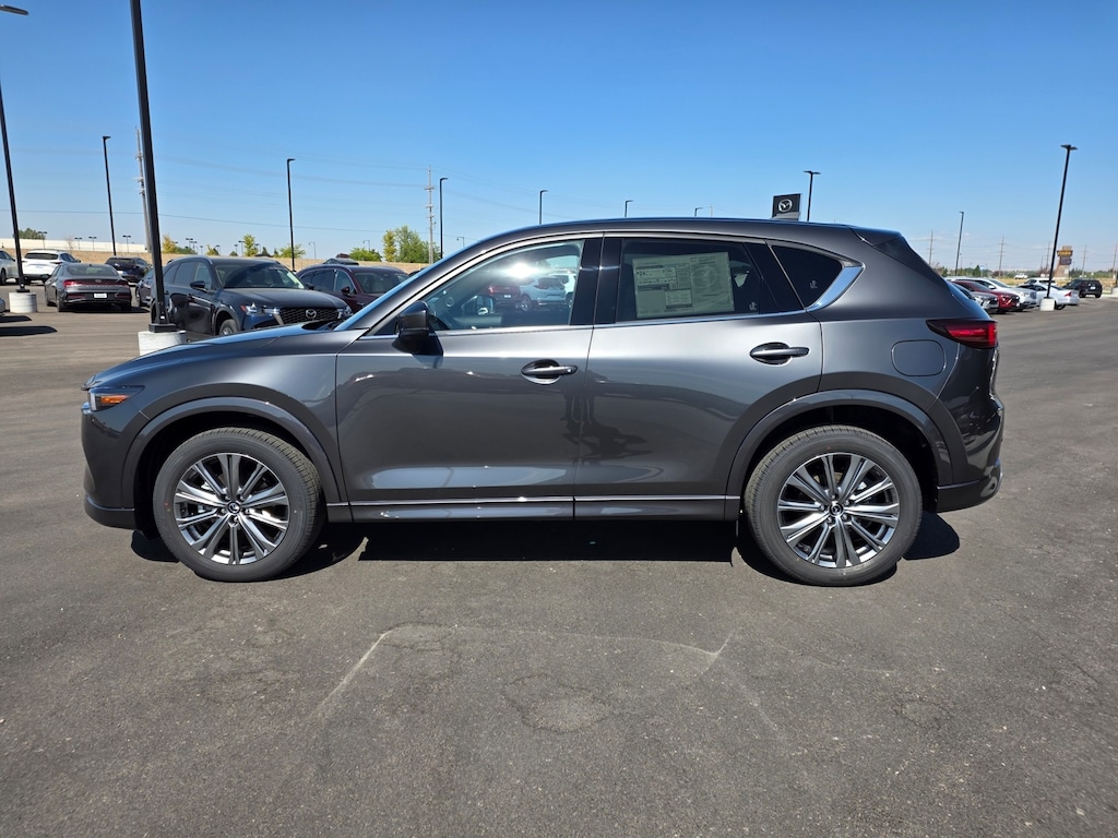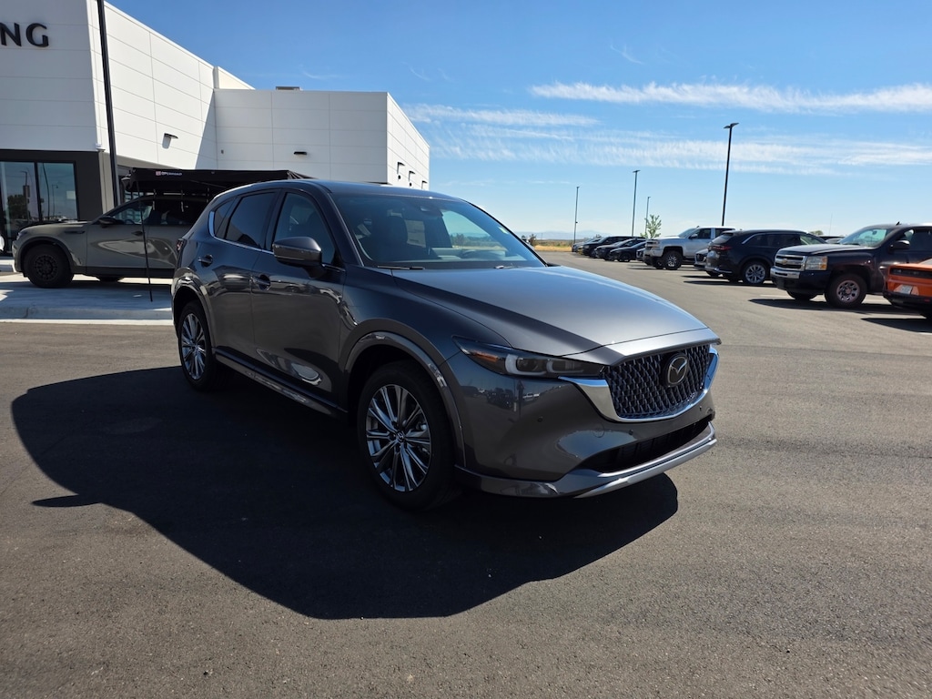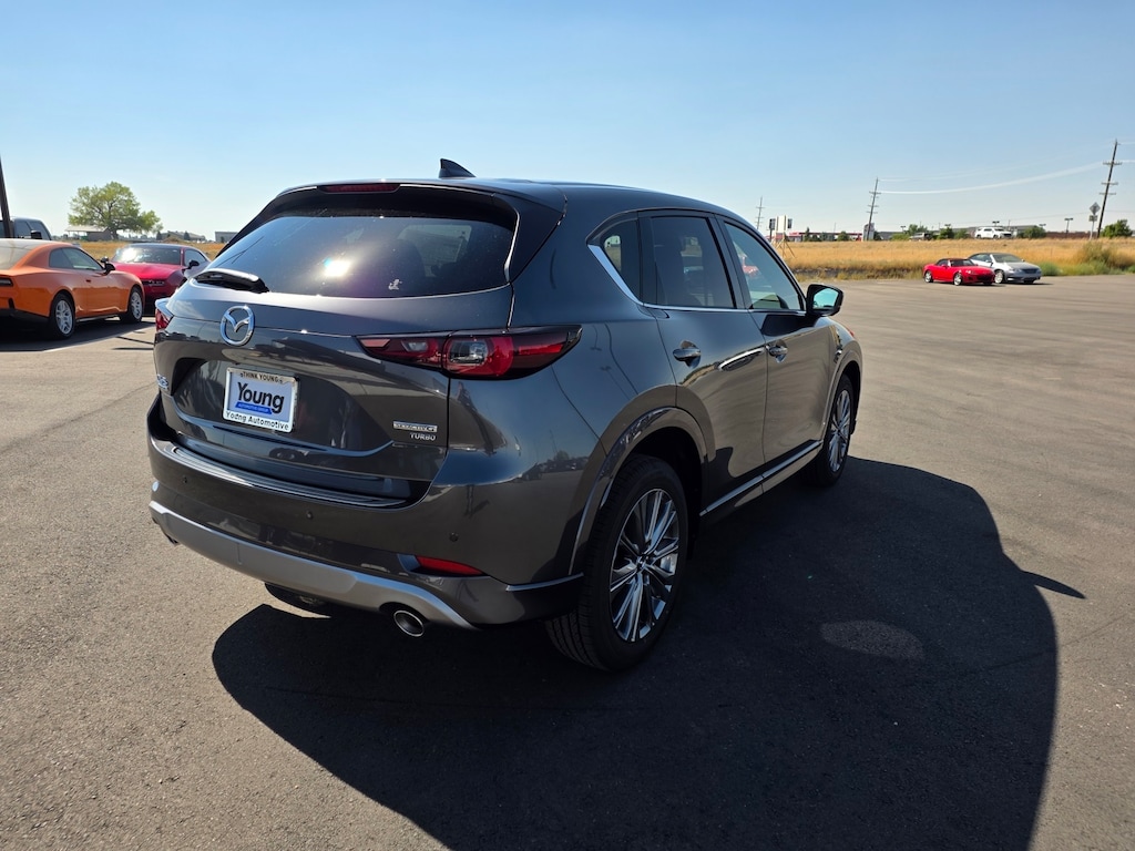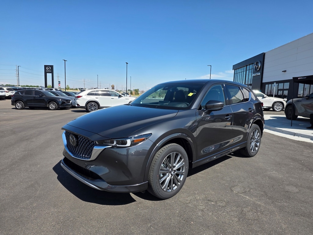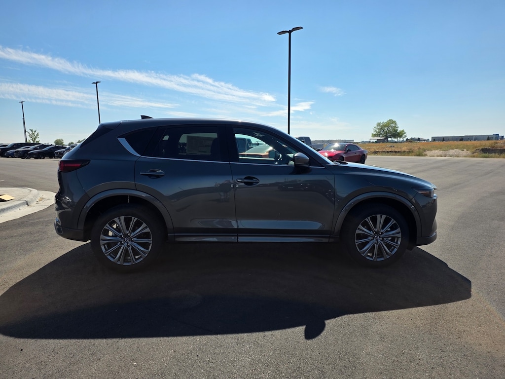 Machine Gray Metallic 2025 Mazda CX-5 2.5 Turbo Signature AWD 6-Speed Automatic 2.5L I4 Active Cruise Control, Apple CarPlay and Android Auto, Auto High-beam Headlights, Auto-dimming Rear-View mirror, Dual front impact airbags, Dual front side impact airbags, Electronic Stability Control, Emergency communication system: MAZDA CONNECT, Four wheel independent suspension, Front anti-roll bar, Front Bucket Seats, Front dual zone A/C, Garage door transmitter: HomeLink, Genuine wood dashboard insert, Genuine wood door panel insert, Heads-Up Display, Heated door mirrors, Heated front seats, Heated rear seats, Heated steering wheel, Illuminated entry, Leather Shift Knob, Leather steering wheel, Memory seat, Nappa Leather Seat Trim, Occupant sensing airbag, Overhead airbag, Power door mirrors, Power driver seat, Power Liftgate, Power moonroof, Power passenger seat, Rain sensing wipers, Rear anti-roll bar, Remote keyless entry, Telescoping steering wheel, Tilt steering wheel, Turn signal indicator mirrors, Ventilated front seats, Wheels: 19" x 7J Aluminum Alloy. 22/27 City/Highway MPG