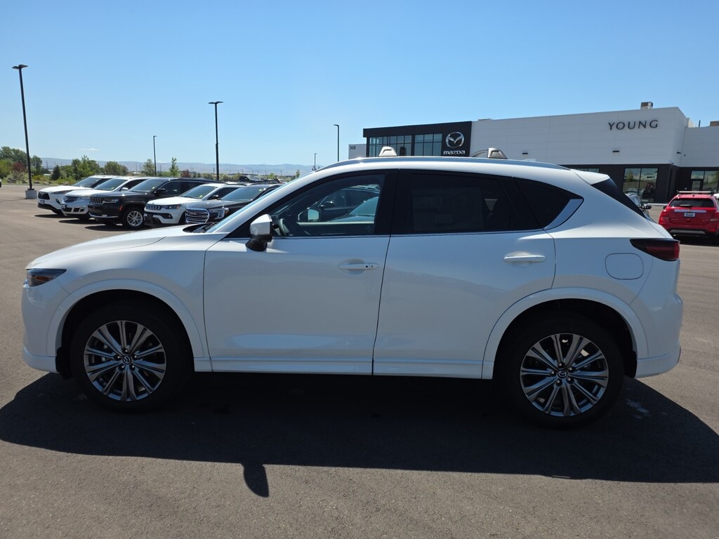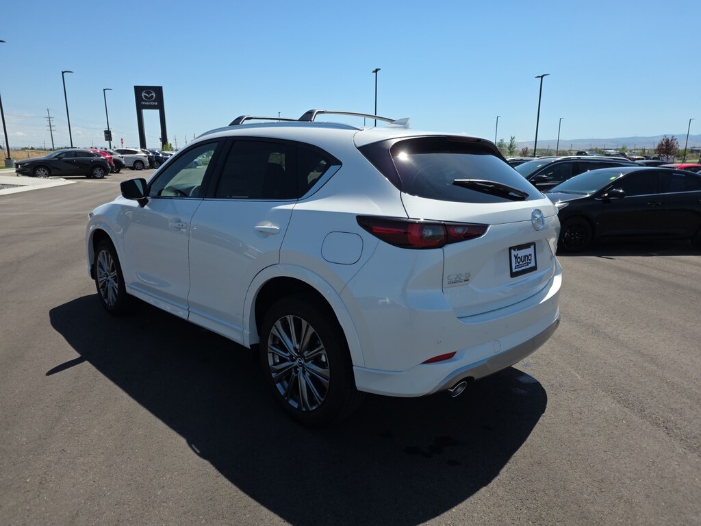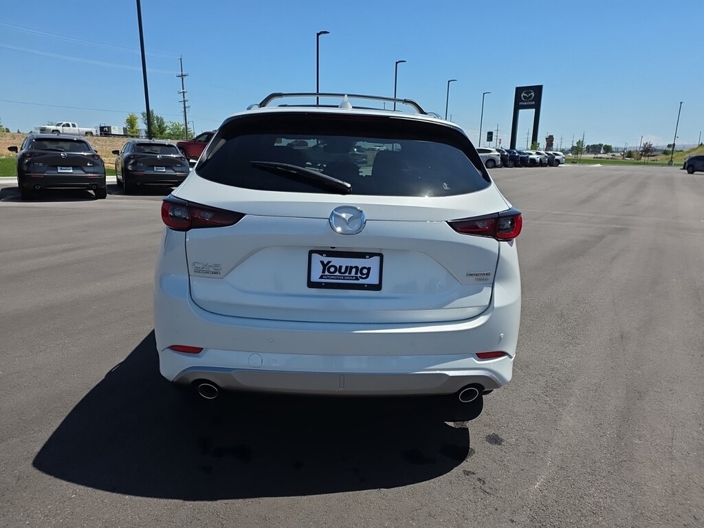 Rhodium White Metallic 2025 Mazda CX-5 2.5 Turbo Signature AWD 6-Speed Automatic 2.5L I4 10 Speakers, Apple CarPlay and Android Auto, Auto High-beam Headlights, Auto-dimming Rear-View mirror, Dual front impact airbags, Dual front side impact airbags, Four wheel independent suspension, Front anti-roll bar, Front dual zone A/C, Garage door transmitter: HomeLink, Genuine wood dashboard insert, Genuine wood door panel insert, Heads-Up Display, Heated door mirrors, Heated rear seats, Heated steering wheel, Heated/Ventilated Front Bucket Seats, Illuminated entry, Leather Shift Knob, Leather steering wheel, Memory seat, Nappa Leather Seat Trim, Occupant sensing airbag, Overhead airbag, Power door mirrors, Power driver seat, Power Liftgate, Power moonroof, Rain sensing wipers, Rear anti-roll bar, Rear window defroster, Remote keyless entry, Rhodium White Metallic Paint, Roof Rails & Cross Bars Package, Steering wheel mounted audio controls, Turn signal indicator mirrors, Wheels: 19" x 7J Aluminum Alloy. 22/27 City/Highway MPG