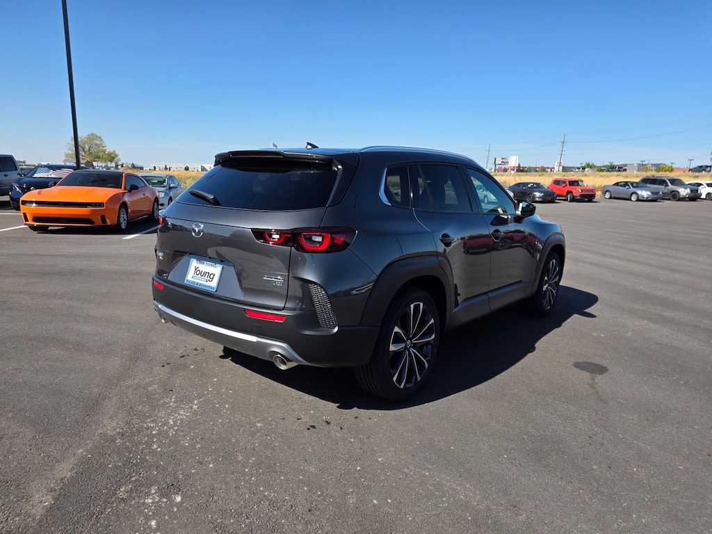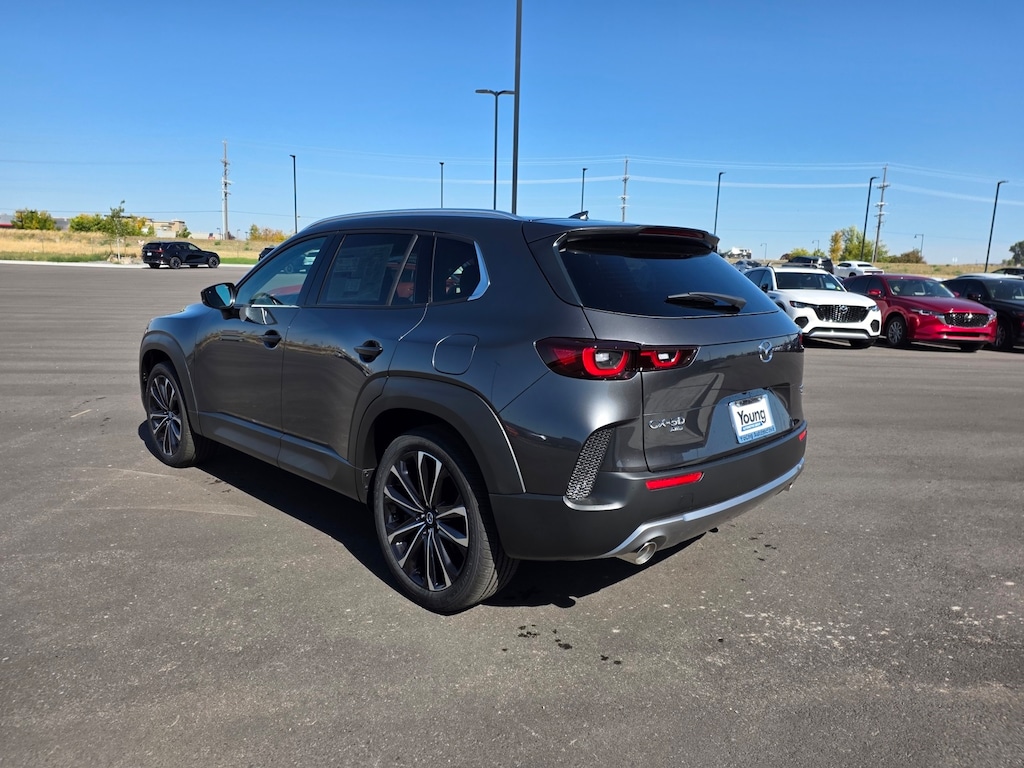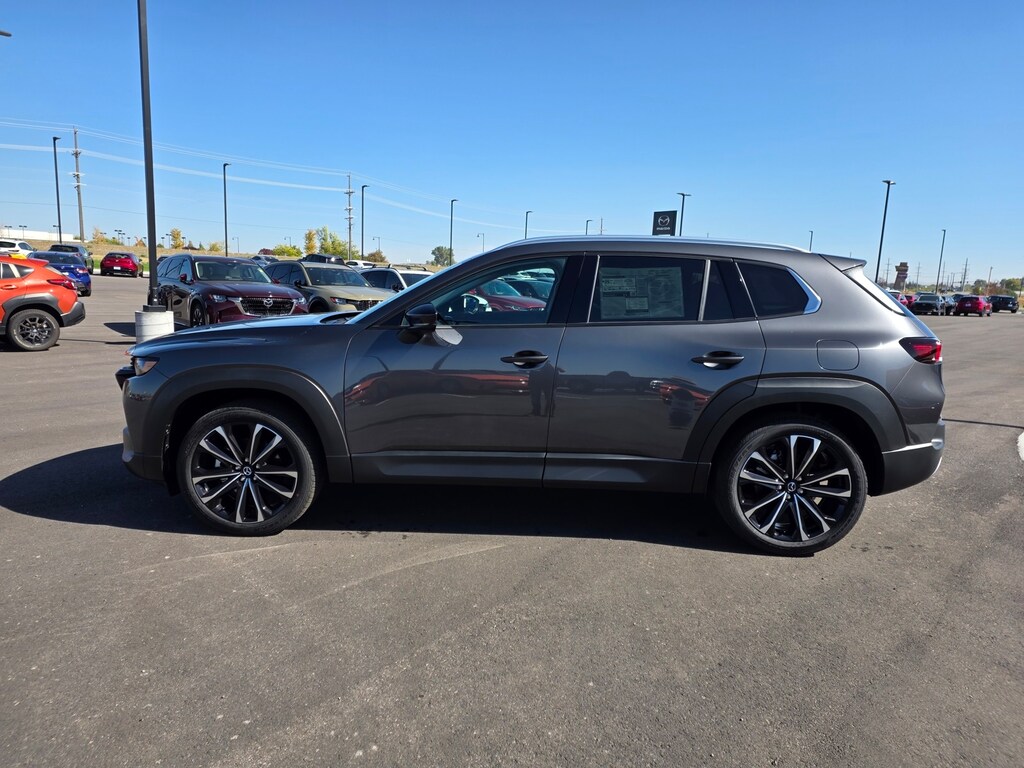 Machine Gray Metallic 2025 Mazda CX-50 2.5 Turbo Premium Package AWD 6-Speed Automatic 2.5L I4 Turbocharged DOHC 16V LEV3-ULEV70 227hp 12 Speakers: BOSE Premium Audio, 20" x 8J Aluminum Alloy Wheels, Apple CarPlay and Android Auto, Auto High-beam Headlights, Auto-dimming Rear-View mirror, Brake assist, Dual front impact airbags, Dual front side impact airbags, Electronic Stability Control, Emergency communication system: MAZDA CONNECT, Front anti-roll bar, Front dual zone A/C, Front wheel independent suspension, Garage door transmitter: HomeLink, Heads-Up Display, Heated & Ventilated Front Bucket Seats, Heated door mirrors, Heated rear seats, Heated steering wheel, Illuminated entry, Knee airbag, Leather Seat Trim, Leather Shift Knob, Leather steering wheel, Machine Gray Metallic Paint, Memory seat, Occupant sensing airbag, Overhead airbag, Power door mirrors, Power driver seat, Power Liftgate, Power moonroof, Power passenger seat, Rain sensing wipers, Remote keyless entry, Speed control, Speed-sensing steering, Telescoping steering wheel, Tilt steering wheel, Turn signal indicator mirrors. 23/29 City/Highway MPG