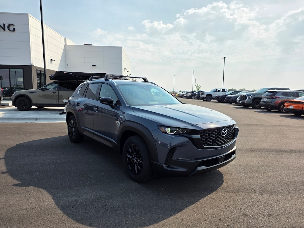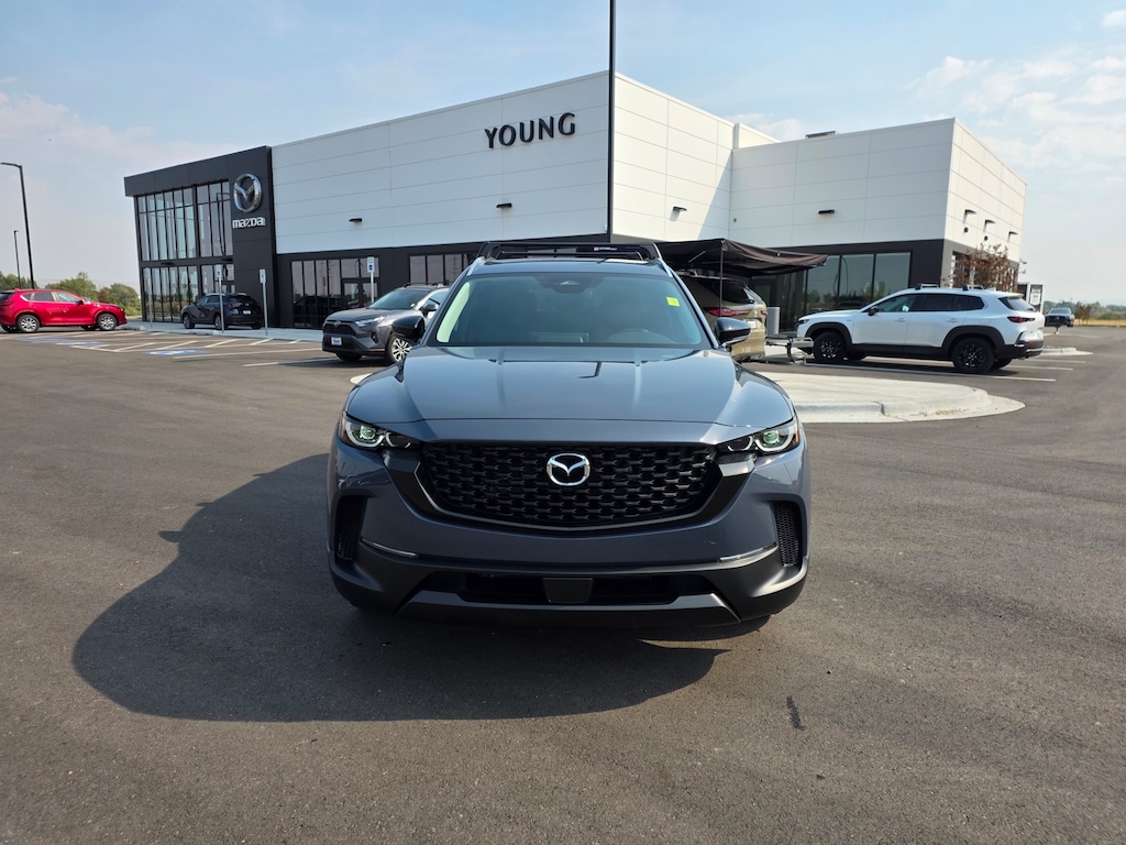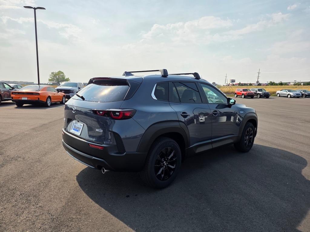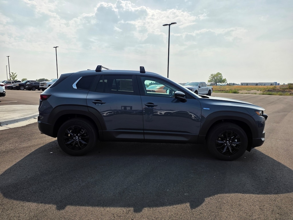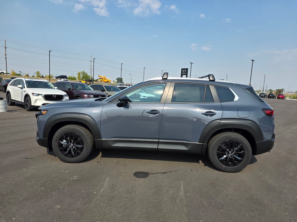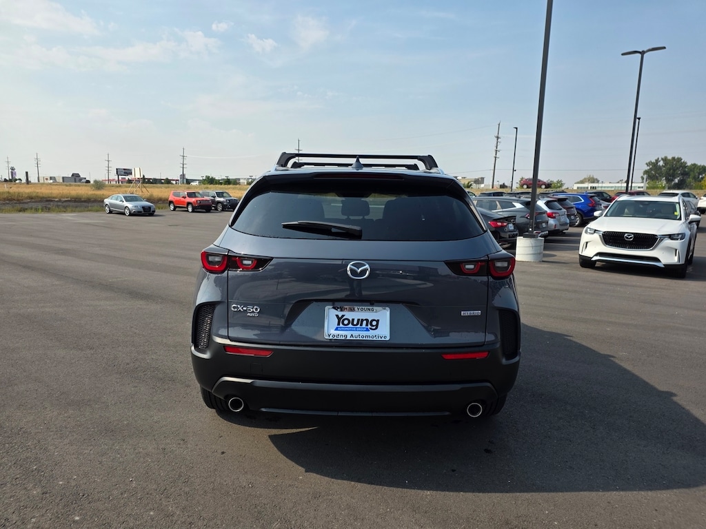 Polymetal Gray Metallic 2025 Mazda CX-50 Hybrid Preferred AWD eCVT 2.5L 4-Cylinder Apple CarPlay and Android Auto, Auto High-beam Headlights, Dual front impact airbags, Dual front side impact airbags, Electronic Stability Control, Emergency communication system: MAZDA CONNECT, Front anti-roll bar, Front Bucket Seats, Front dual zone A/C, Front wheel independent suspension, Half Leatherette Seat Trim, Heated door mirrors, Heated front seats, Illuminated entry, Knee airbag, Leather Shift Knob, Leather steering wheel, Occupant sensing airbag, Overhead airbag, Power door mirrors, Power driver seat, Power Liftgate, Rain sensing wipers, Remote keyless entry, Speed control, Speed-sensing steering, Telescoping steering wheel, Tilt steering wheel, Turn signal indicator mirrors, Wheels: 17" x 7J Black Metallic Finish Alloy. 39/37 City/Highway MPG