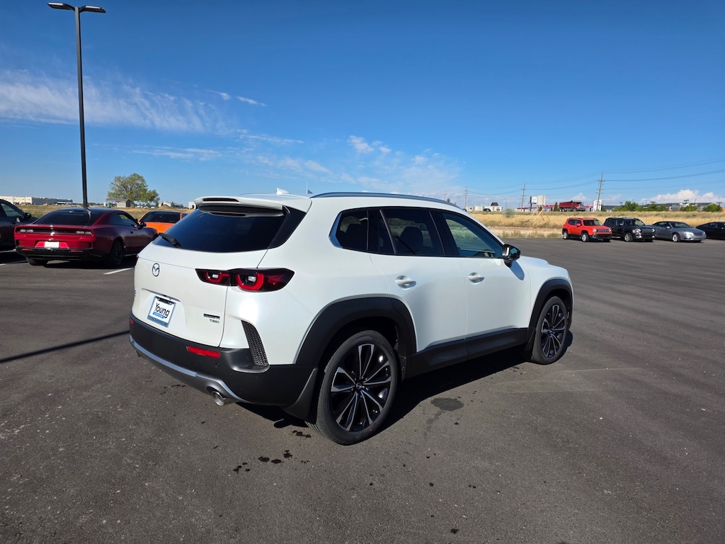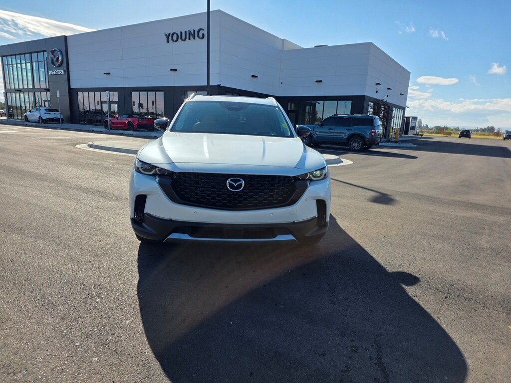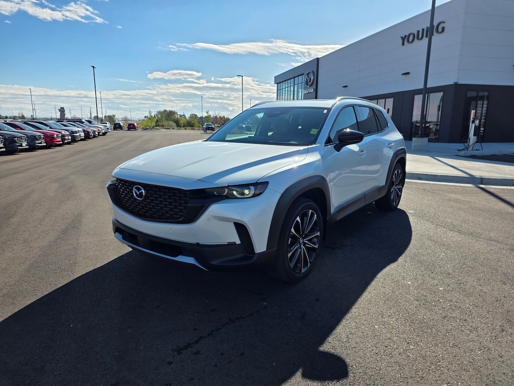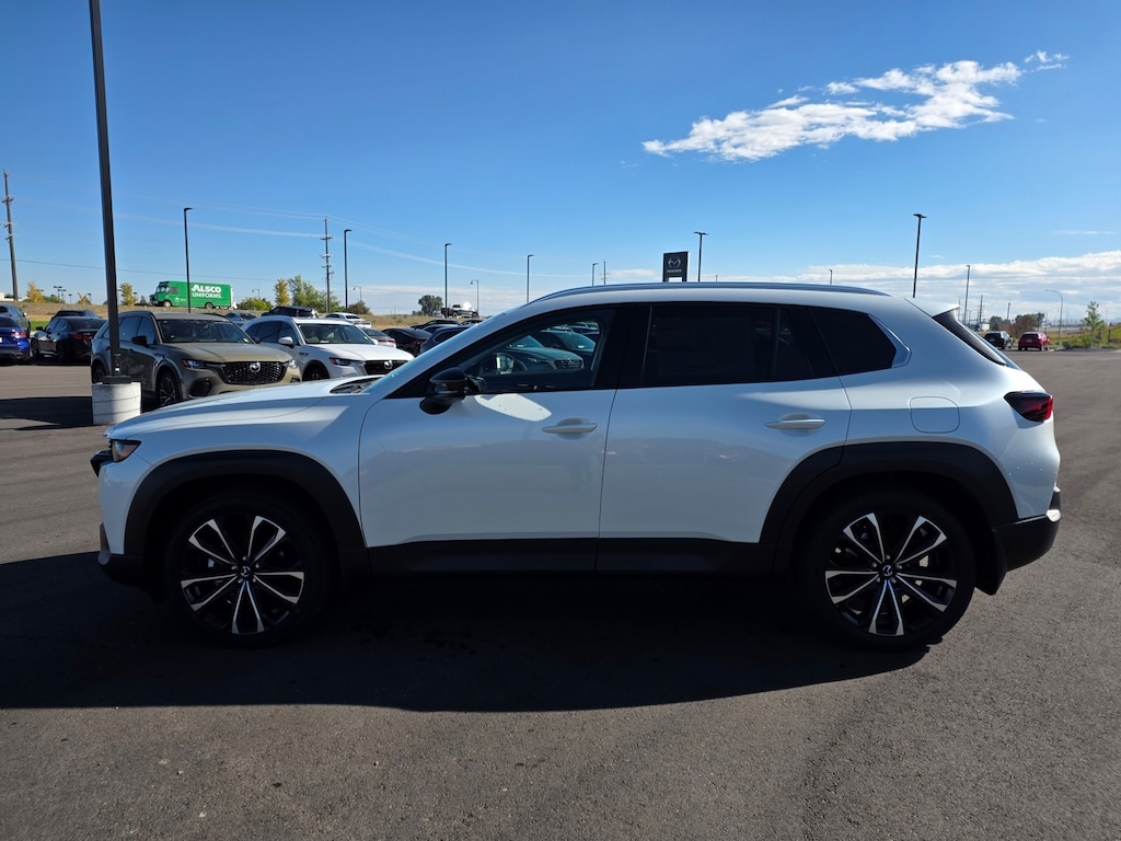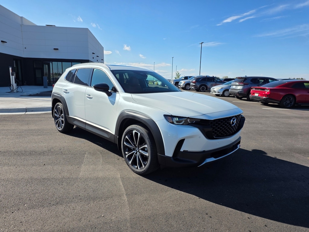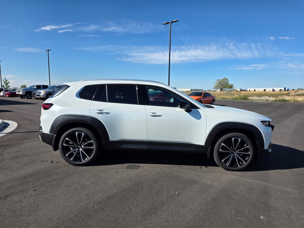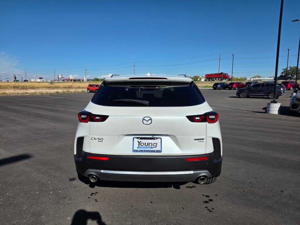 Wind Chill Pearl 2025 Mazda CX-50 2.5 Turbo Premium Plus Package AWD 6-Speed Automatic 2.5L I4 Turbocharged DOHC 16V LEV3-ULEV70 227hp 12 Speakers: BOSE Premium Audio, 20" x 8J Aluminum Alloy Wheels, Apple CarPlay and Android Auto, Auto High-beam Headlights, Auto-dimming door mirrors, Auto-dimming Rear-View mirror, Brake assist, Dual front impact airbags, Dual front side impact airbags, Emergency communication system: MAZDA CONNECT, Front anti-roll bar, Front dual zone A/C, Front wheel independent suspension, Garage door transmitter: HomeLink, Heads-Up Display, Heated & Ventilated Front Bucket Seats, Heated rear seats, Heated steering wheel, Illuminated entry, Knee airbag, Leather Seat Trim, Leather Shift Knob, Leather steering wheel, Memory seat, Occupant sensing airbag, Overhead airbag, Power door mirrors, Power driver seat, Power Liftgate, Power moonroof, Power passenger seat, Rain sensing wipers, Remote keyless entry, Speed control, Speed-sensing steering, Telescoping steering wheel, Tilt steering wheel, Turn signal indicator mirrors. 23/29 City/Highway MPG