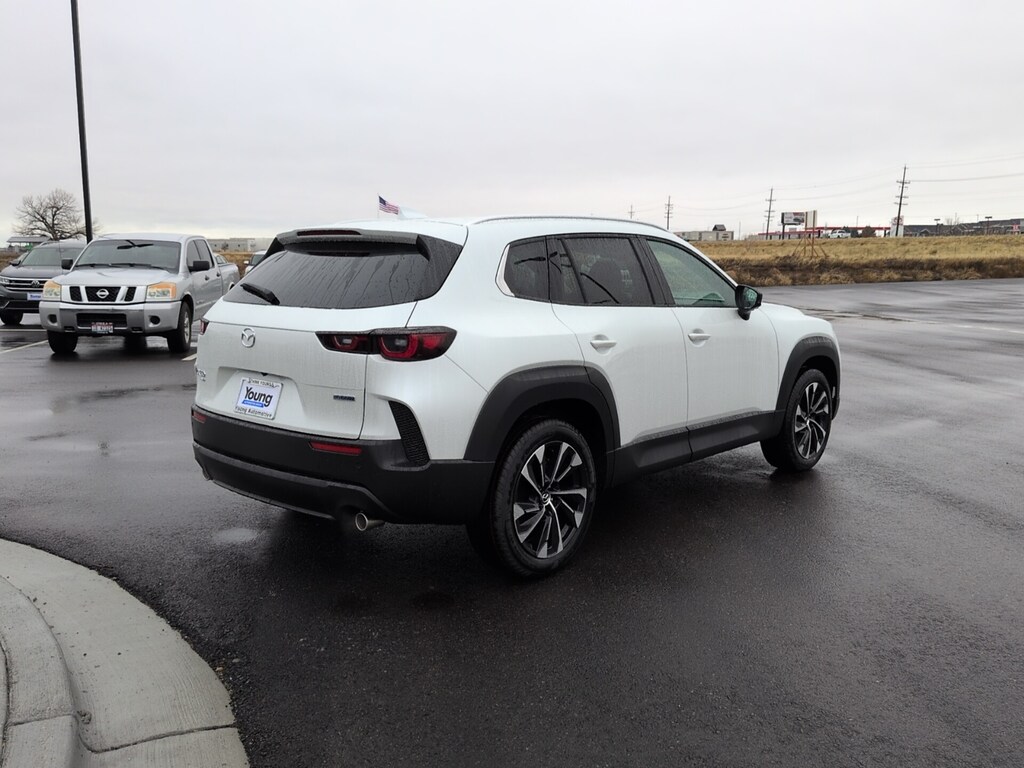 Wind Chill Pearl 2026 Mazda CX-50 Hybrid Premium Plus AWD CVT 2.5L 4-Cylinder ABS brakes, Active Cruise Control, Alloy wheels, Electronic Stability Control, Front dual zone A/C, Heated door mirrors, Heated front seats, Heated rear seats, Illuminated entry, Leather Seat Trim, Low tire pressure warning, Power Liftgate, Power moonroof, Remote keyless entry, Traction control. 39/37 City/Highway MPG
