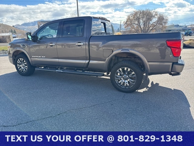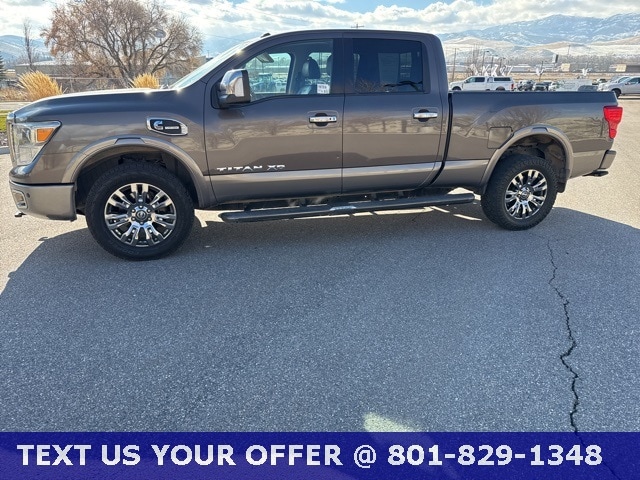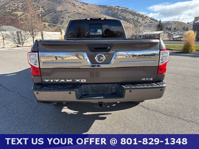 From its bold exterior design and striking wheels to its suite of driver-assist features, this Titan XD balances rugged capability with refined comfort. Whether working hard or hitting the open road, drive with confidence in a truck that delivers strength, style, and sophistication. SOLD AS-IS! CLEAN VEHICLE HISTORY REPORT - NO ACCIDENTS, 2 Years of Maintenance Included, 12 Speakers, Auto-dimming door mirrors, Chrome wheels, Delay-off headlights, Electronic Locking Tailgate, Electronic Stability Control, Front fog lights, Heated door mirrors, Heated front seats, Heated rear seats, Memory seat, Navigation System, Platinum Reserve Utility Bed Package, Platinum Utility Package, Power driver seat, Radio: NissanConnect w/Navigation & Mobile Apps, Rain sensing wipers, Rear Utility Bed Step, Remote keyless entry, Rockford Fosgate Premium Audio w/12 Speakers, Siri Eyes Free, Speed-Sensitive Wipers, Steering wheel memory, Telescoping steering wheel, Tilt steering wheel, TITAN Box, Turn signal indicator mirrors, Variably intermittent wipers. Platinum Reserve Java Metallic 5.0L V8 6-Speed Automatic 4WD